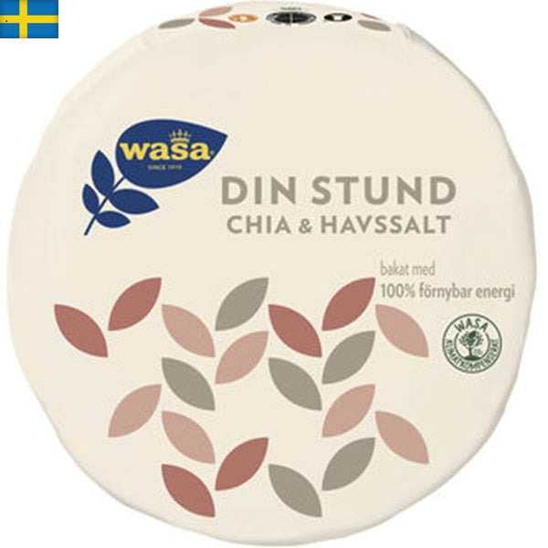 Wasa Knäckebröd Din Stund Chia & Sea Salt is a tasty and crunchy cracker made from whole grain rye flour. Enjoy this Chia Cracker Bread with Sea Salt when you have a moment to yourself. In addition to a lovely round taste and a lot of dietary fiber, you get a harmonious moment. A round crisp bread can easily be broken into as large pieces as you want. Use the hard bread as croutons or serve with the cheese platter. Chia seeds give this fiber cracker a nutty flavor that enhances the flavors of your spread. Wasa Crispbread Din Stund Chia & Sea Salt is 100% climate compensated.